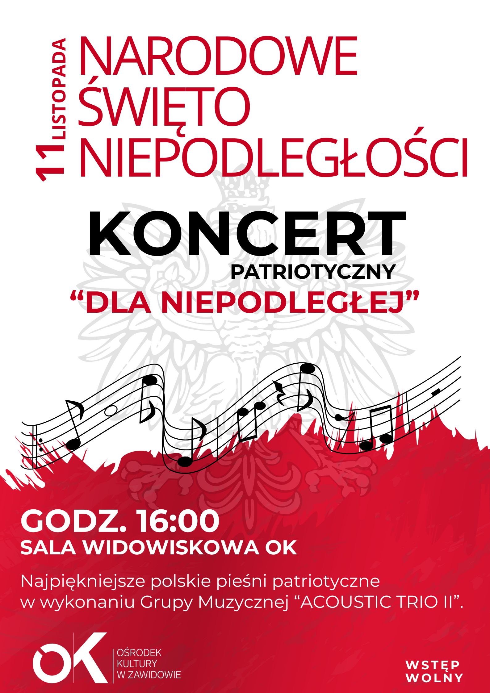 Z okazji Narodowego Święta Niepodległości serdecznie zapraszamy na wyjątkowy koncert pn. „Dla Niepodległej”, w wykonaniu Grupy Muzycznej „ACOUSTIC TRIO II” w składzie: