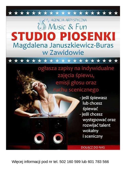 Profesjonalne zajęcia wokalne, wokalistyka rozrywkowa, emisja głosu, interpretacja piosenki, dykcja i artykulacja. Pokonanie tremy, opanowanie ruchu scenicznego, zapanowanie nad głosem i rozwinięcie skali to wszystko proponuje Studio Piosenki Magdaleny Januszkiewicz-Buras.