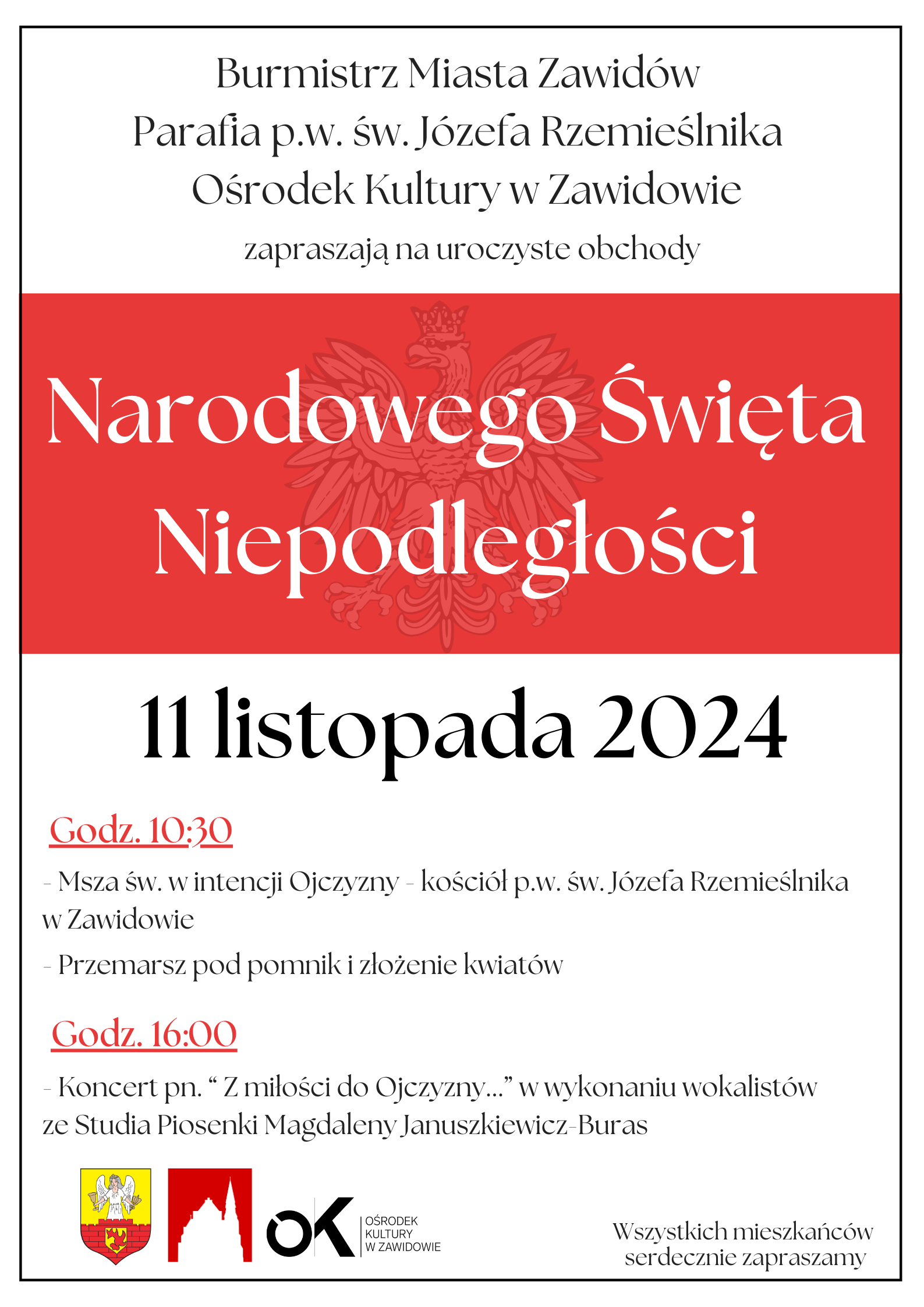 Serdecznie zapraszamy do udziału w obchodach 106. rocznicy odzyskania przez Polskę niepodległości.