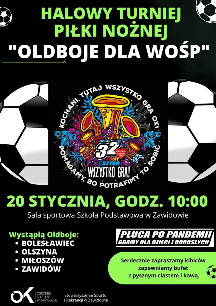 W najbliższą sobotę, 20 stycznia o godz. 10:00 w sali sportowej w Szkole Podstawowej w Zawidowie odbędzie się Halowy Turniej Piłki Nożnej „Oldboje dla WOŚP”.