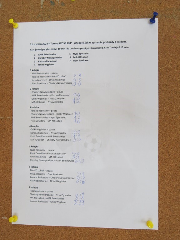 Zawody rozpoczęły się o godz. 9:00, w turnieju wzięło udział 7 zaprzyjaźnionych drużyn ze Zgorzelca, Nowogrodźca, Lubania, Węglińca, Bolesławca, Radostowa i Zawidowa. Rozgrywki zostały rozegrane w kat. Żak. Tego dnia każda drużyna była wygrana i nie prowadziliśmy klasyfikacji turniejowej. Panowała dobra zabawa, czysta radość z gry w piłkę nożną i przede wszystkim wsparcie WOŚP.