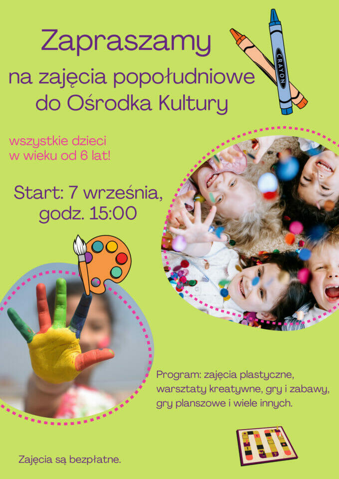 Wakacje za Nami, a my nie zwalniamy tempa i serdecznie zapraszamy wszystkie dzieci w wieku od 6 lat na zajęcia popołudniowe do Ośrodka Kultury.